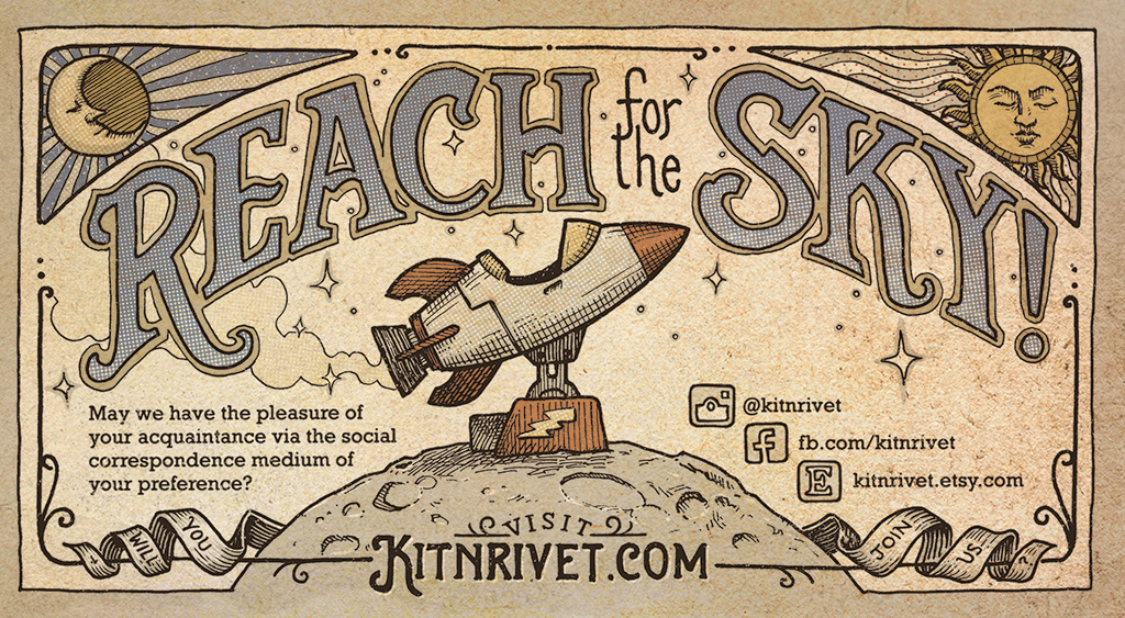 Kit n’ Rivet create original prints, comics, pins, and other crafty ephemera. The married duo are embodied by a cat and robot mascot, representing their unique styles using watercolors, pencil, ink, and digital tools. Genres range from ninja cats, space animal adventures, fun pop-culture homages, circus robots and more!