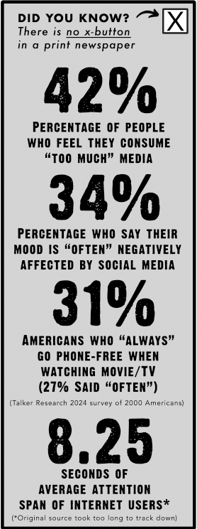 Online content can often be tainted by misinformation, clickbait headlines, and unverified sources without clear indication as to their promotional, satirical, or humorous nature. The ease of web publication has led to a growing skepticism about the quality and accuracy of information found online. Print journalism, however, is generally held to a high editorial standard, with established publication often relying on professional reporters and fact-checking processes that ensure quality and credibility. Print is less prone to algorithmic bias, fickle trends, influencer personalities, and rather push toward an earnestly curious mindset.